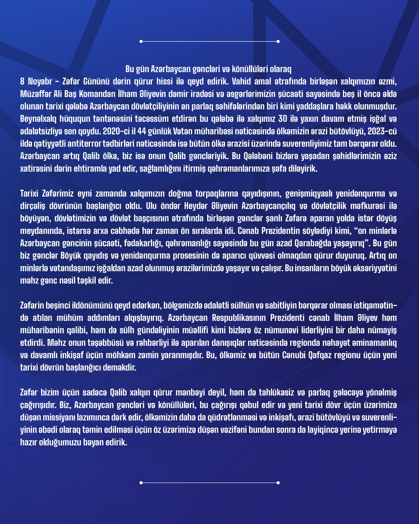 Azərbaycanın gənclər və könüllü təşkilatlarının Zəfər Gününün 5-ci ildönümü ilə bağlı birgə bəyanatını sizlərə təqdim edirik.