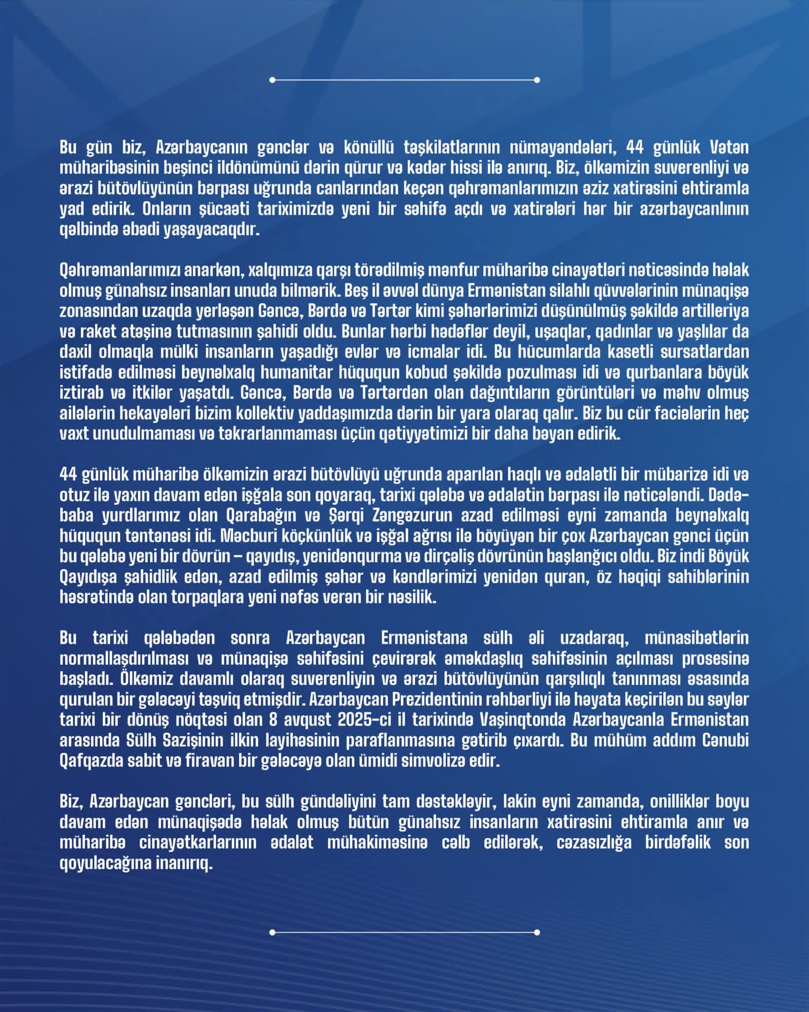 📣 Ölkənin gənclər və könüllü təşkilatları 44 günlük Vətən müharibəsinin 5-ci ildönümü ilə bağlı beynəlxalq təşkilatlara ünvanladığı bəyanatı sizlərə təqdim edirik.