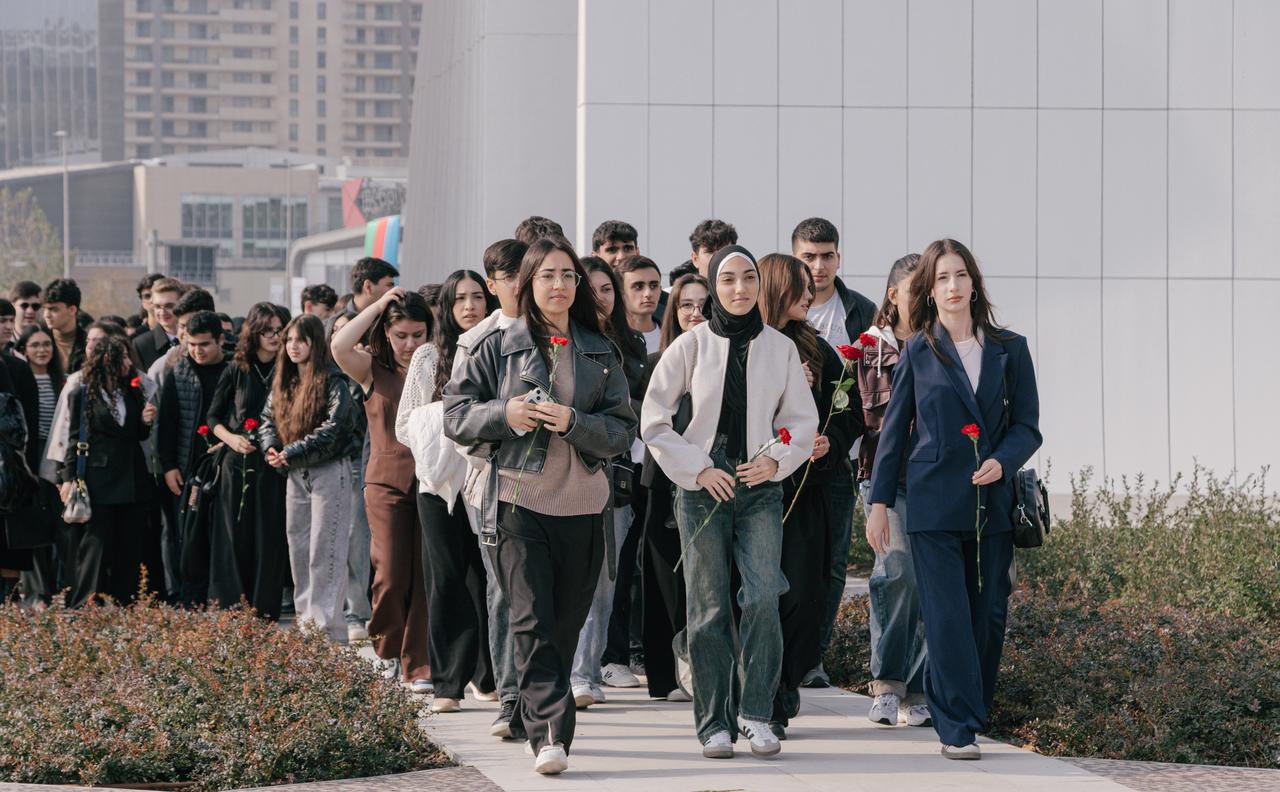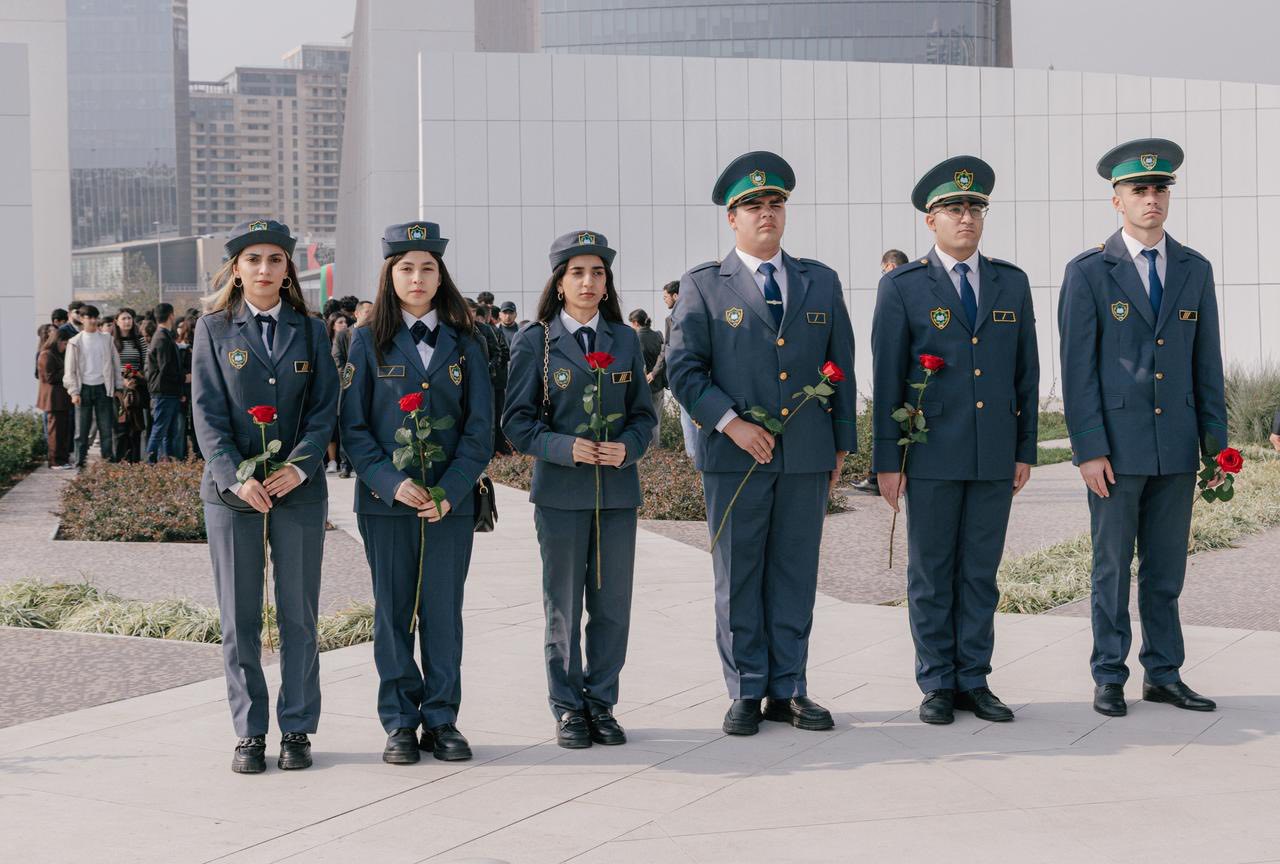 İştirakçılar qəhrəman şəhidlərimizin xatirəsini dərin ehtiramla yad edərək abidə önünə gül dəstələri düzüblər.